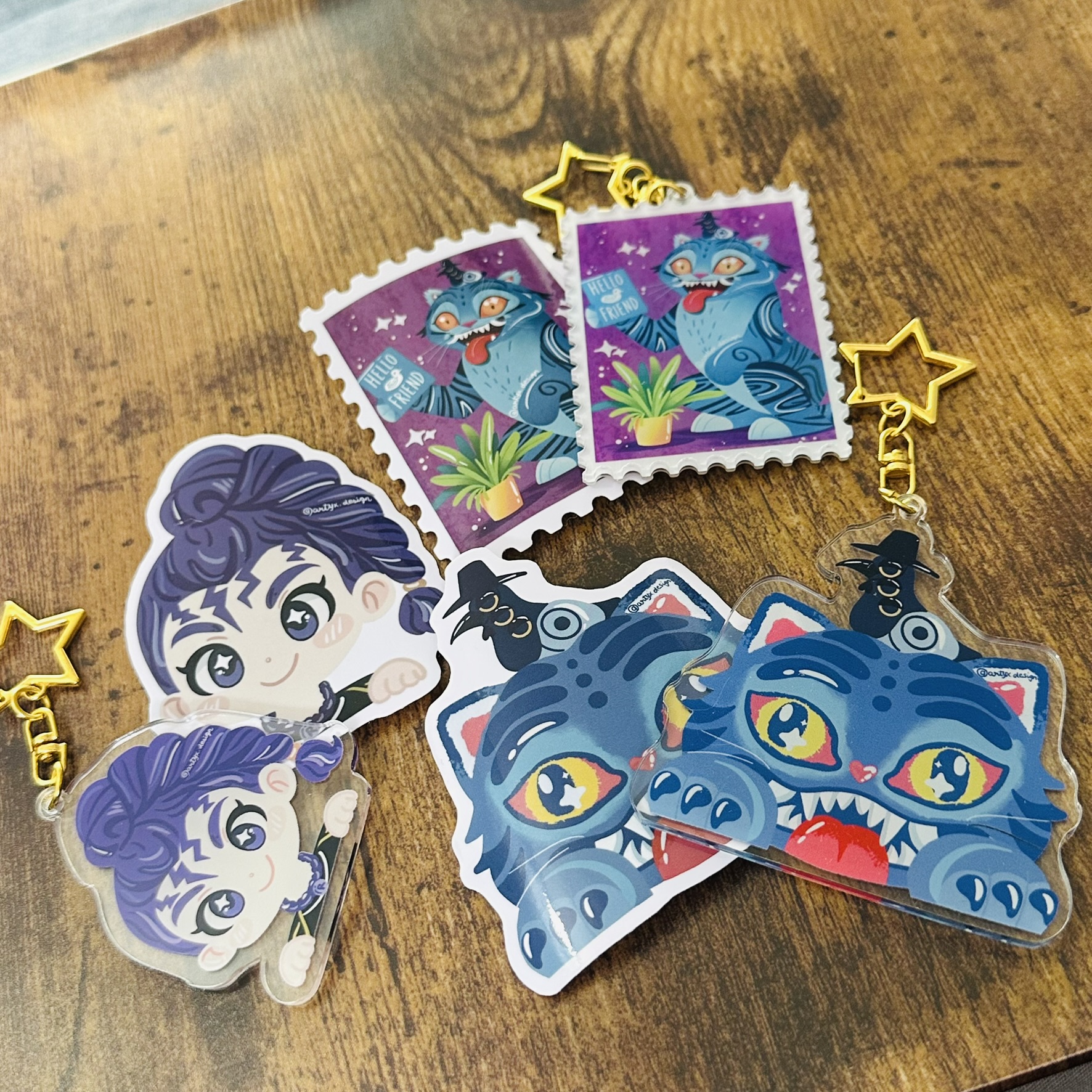 These acrylic keychains are mini versions of my hand-made art and sticker designs, paired with a golden star hook for a cute, premium touch.