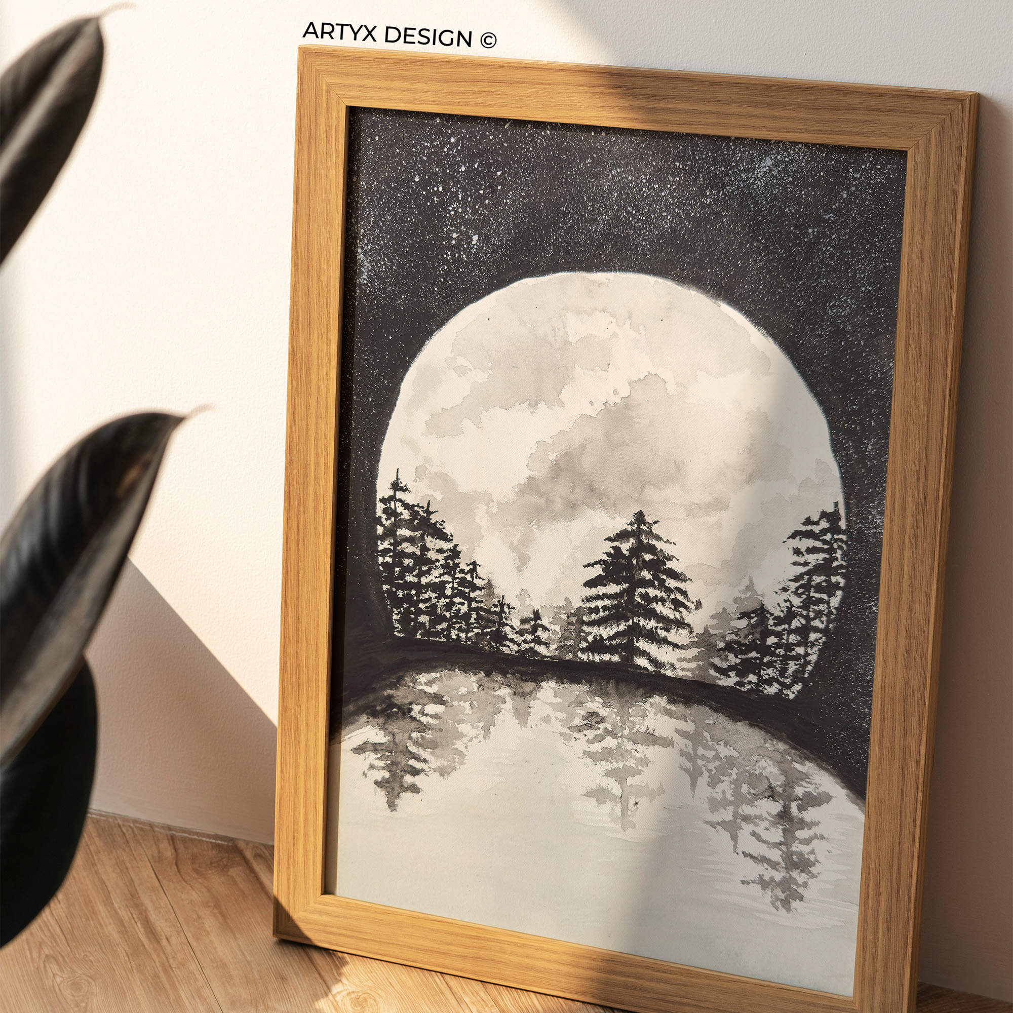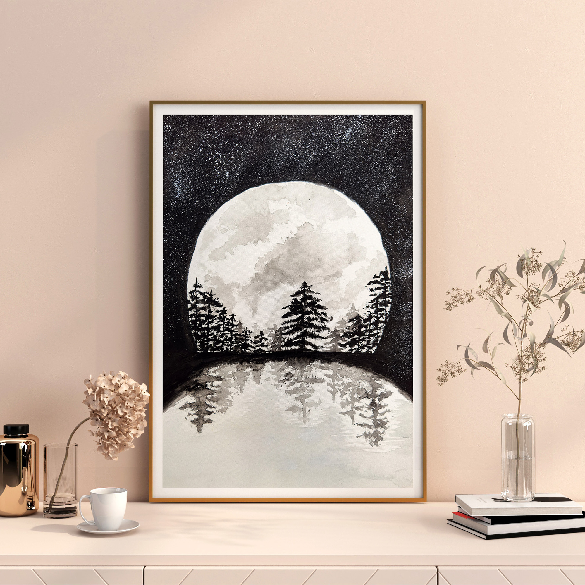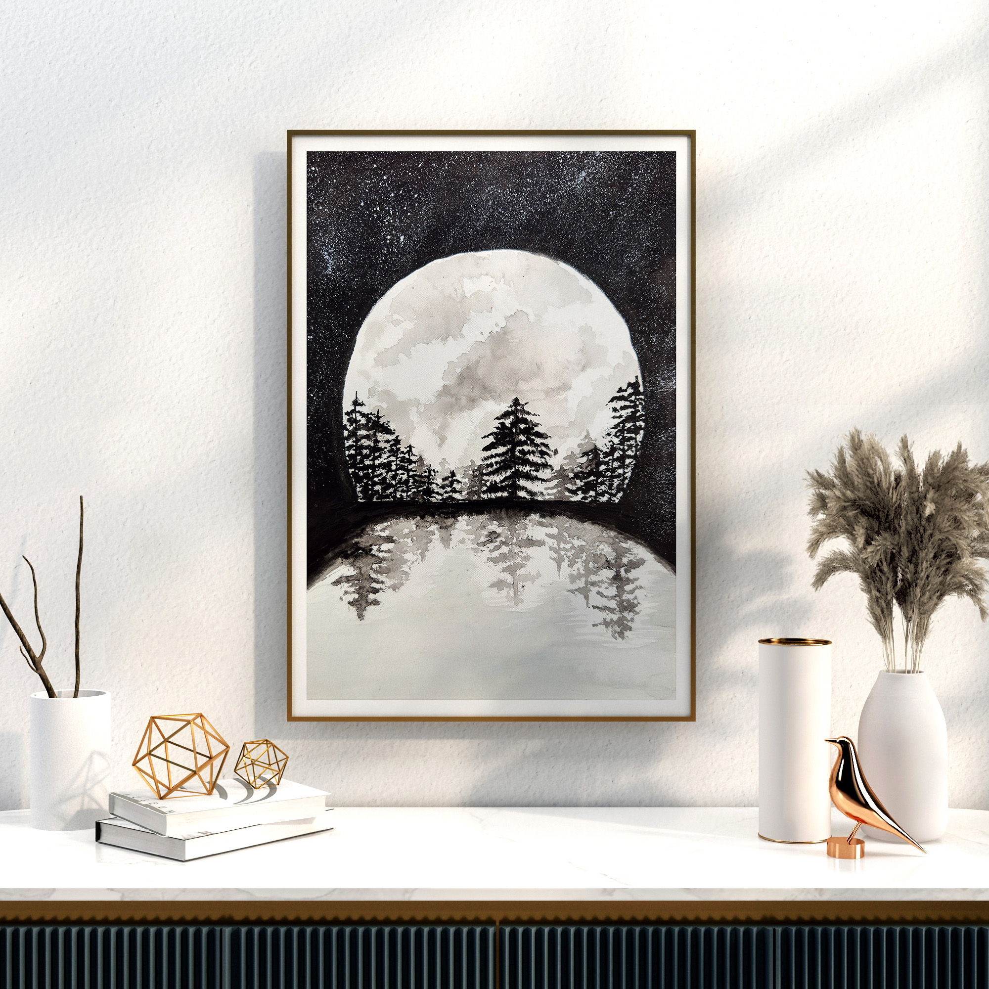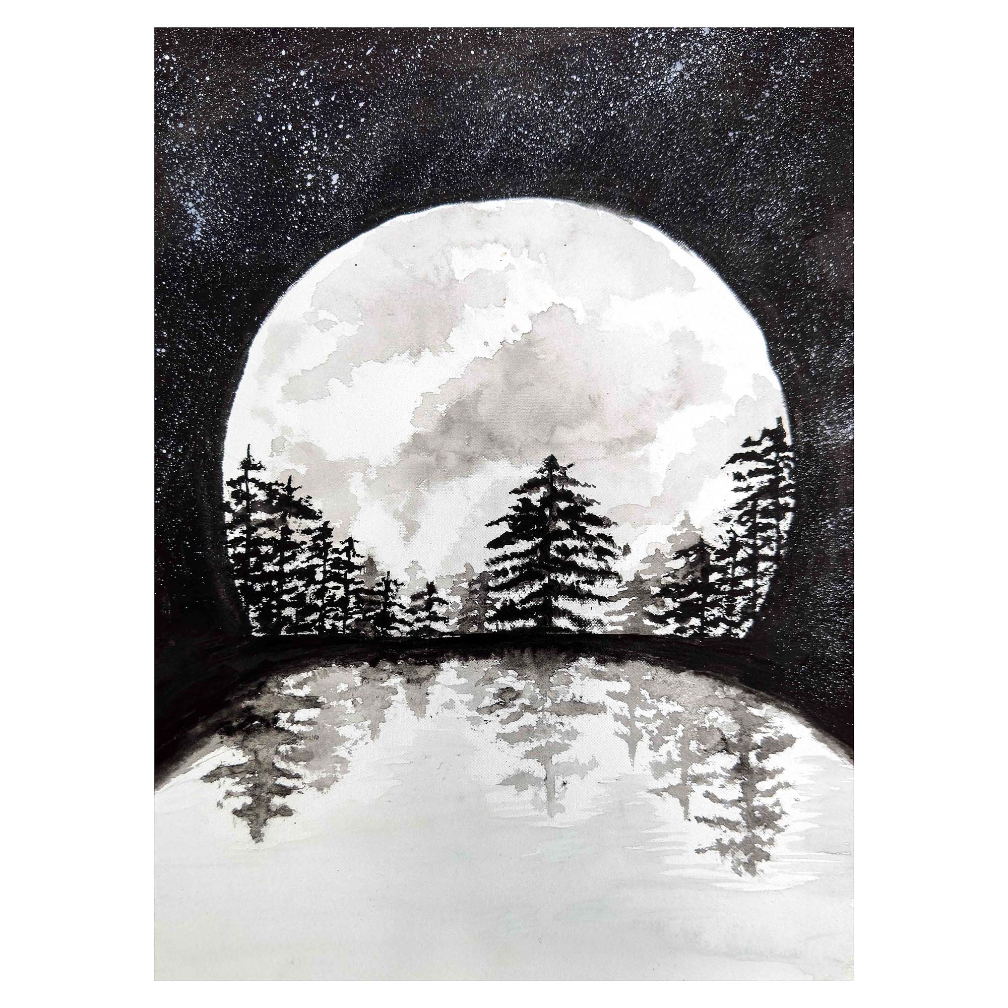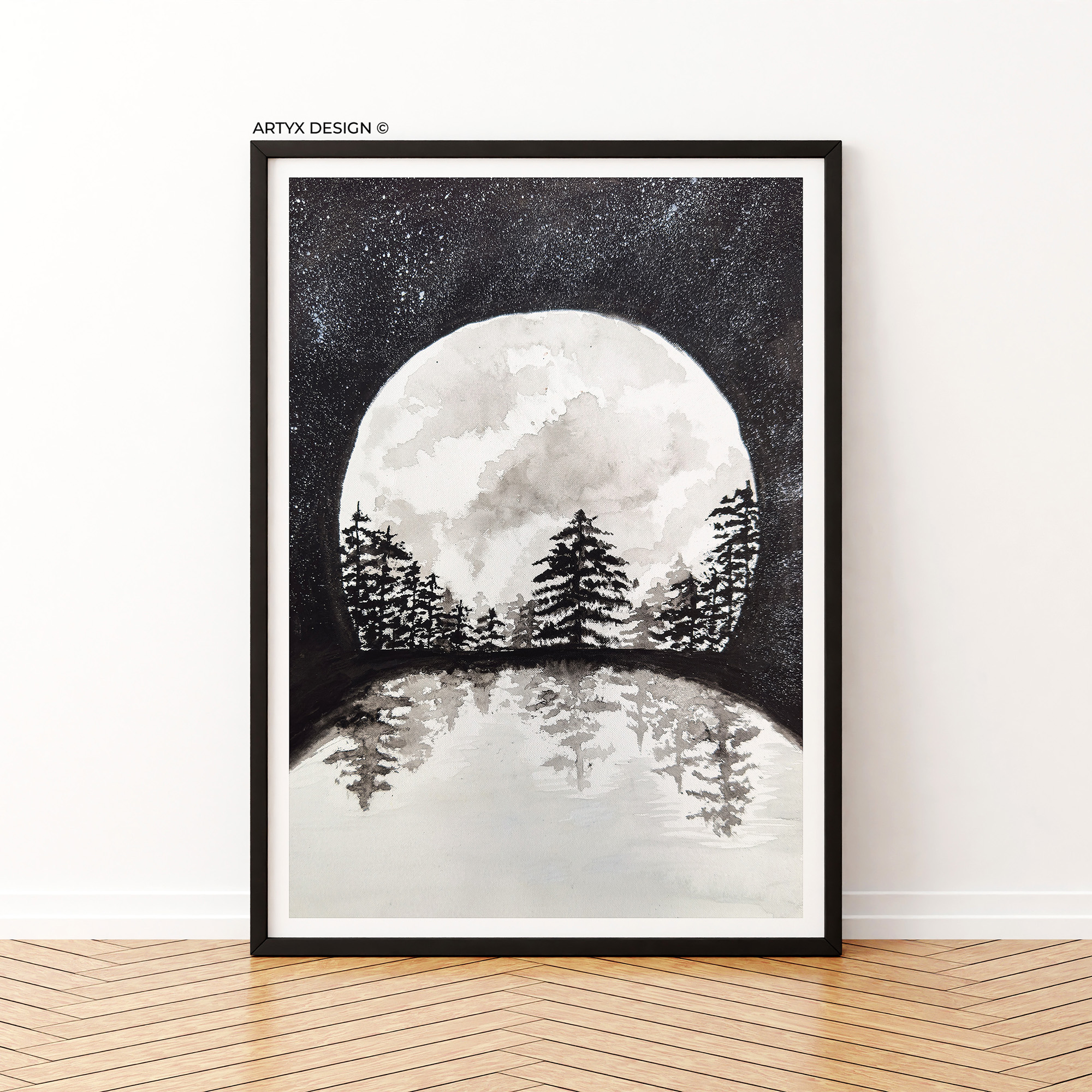 “Moonlit Reflection” is a serene black and white painting depicting a half moon gracefully mirrored in still waters. This minimalist piece captures the tranquil interplay of light and shadow, evoking a sense of calm and timelessness. Perfect for adding a touch of elegance and serenity to any space.