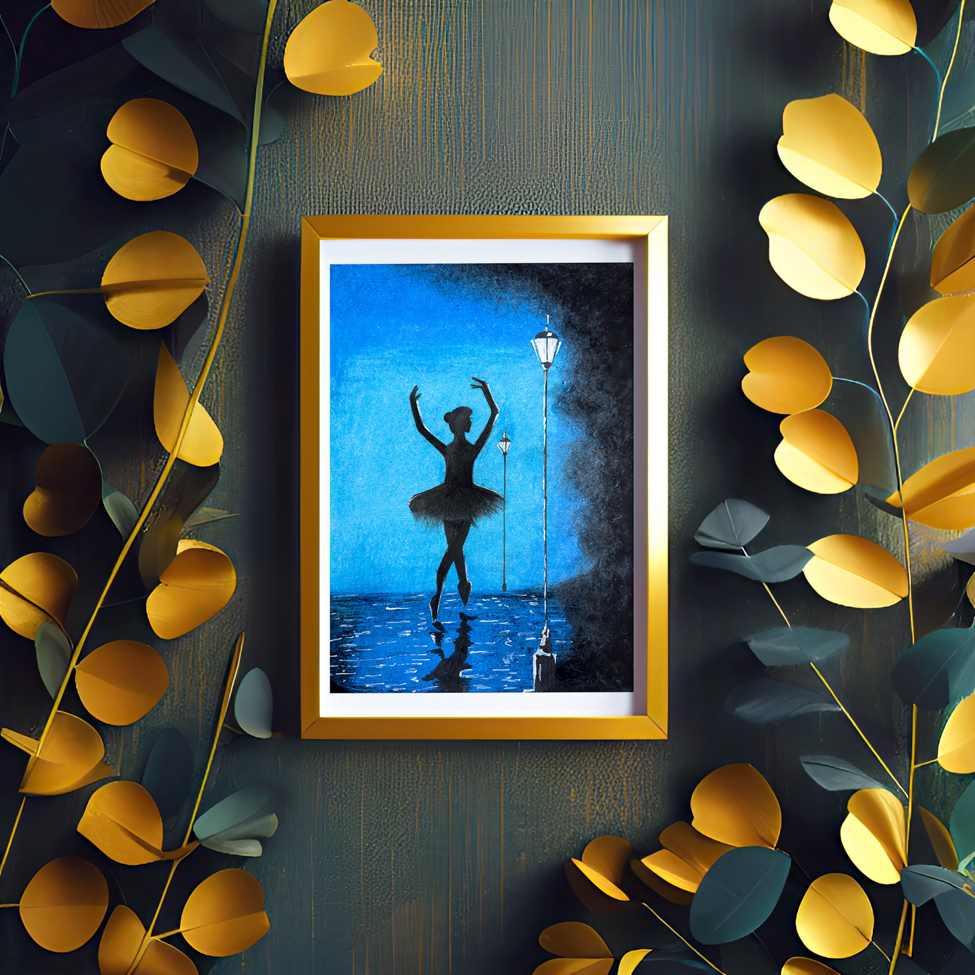 “Rain Dance” portrays a girl belly dancing joyfully on city streets, bathed in a cascade of rain. The scene, rendered in soothing blue tones, captures the elegance and freedom of her movements amidst the rain, creating a captivating blend of rhythm and tranquility. This painting celebrates the beauty and grace of spontaneous expression in the midst of a rainy urban landscape.
