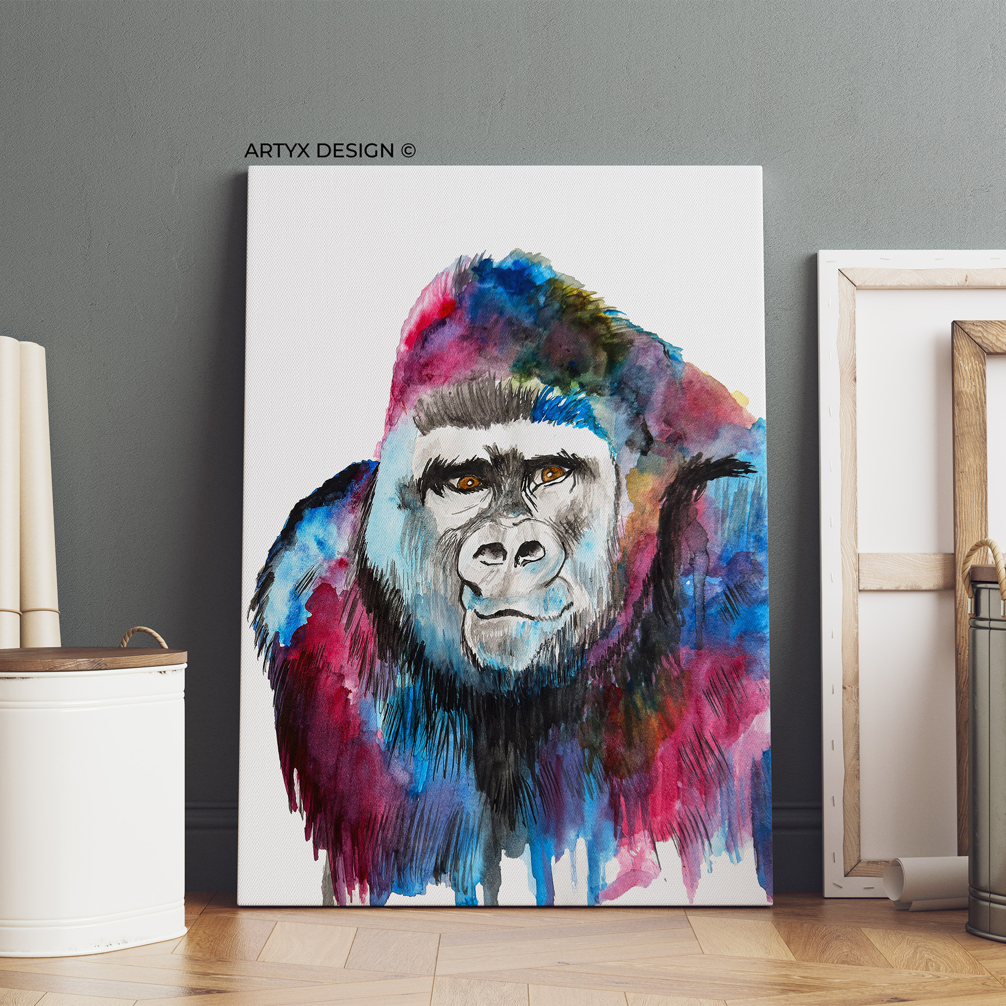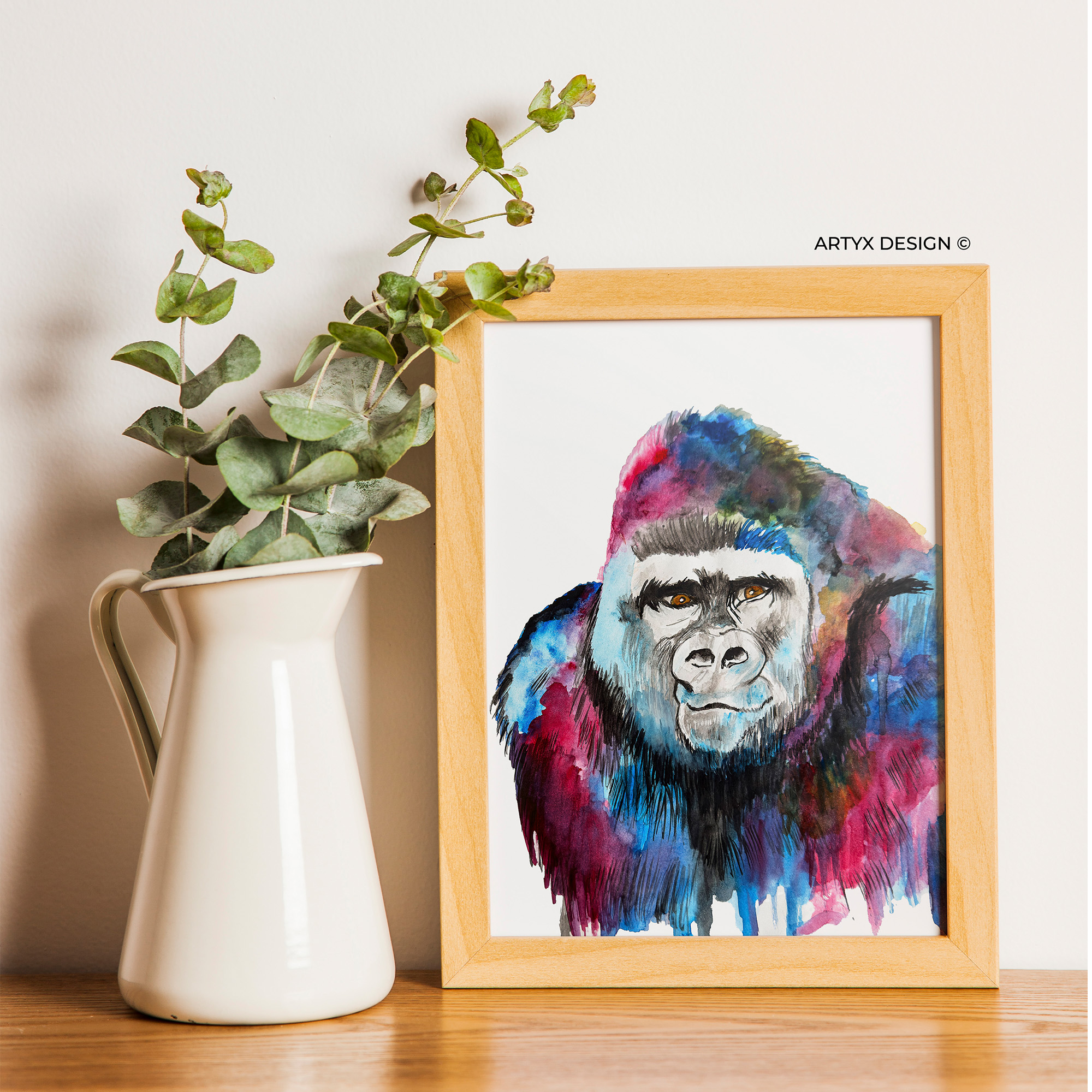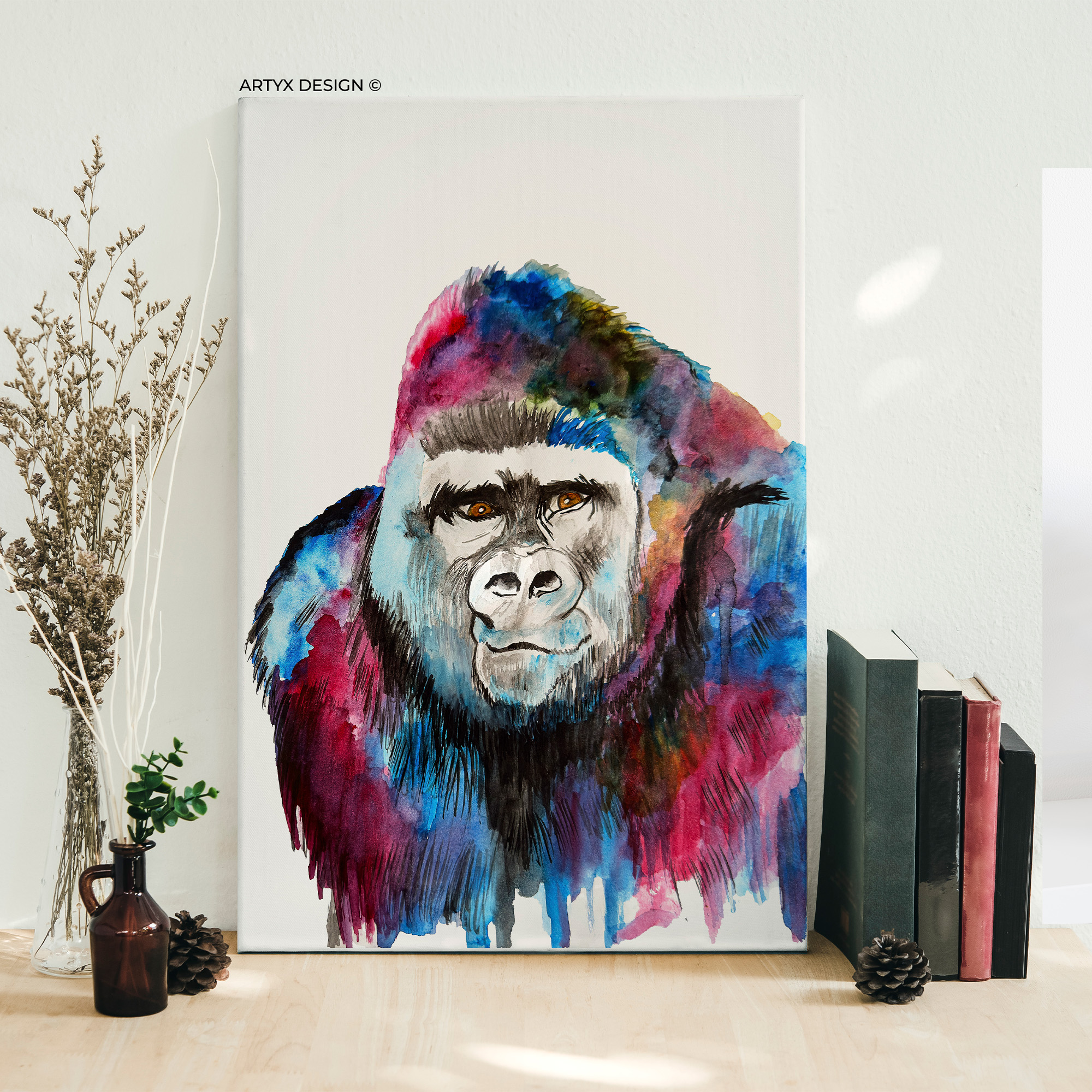 “Vibrant Gorilla” features a charming, colorful depiction of a cute gorilla. The painting’s vivid hues and playful expression bring a lively and endearing quality to this majestic creature. This artwork celebrates the gorilla’s gentle spirit and captivating presence through a burst of color and whimsy.