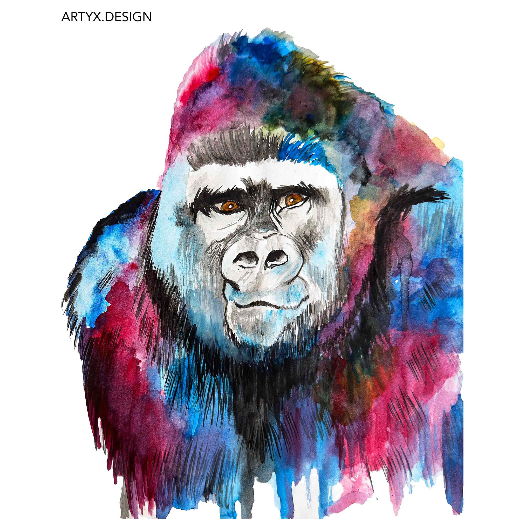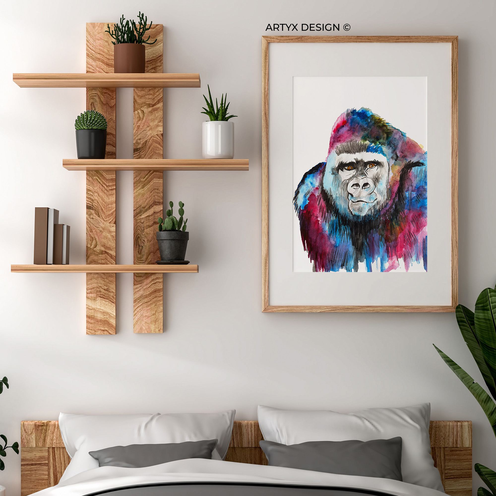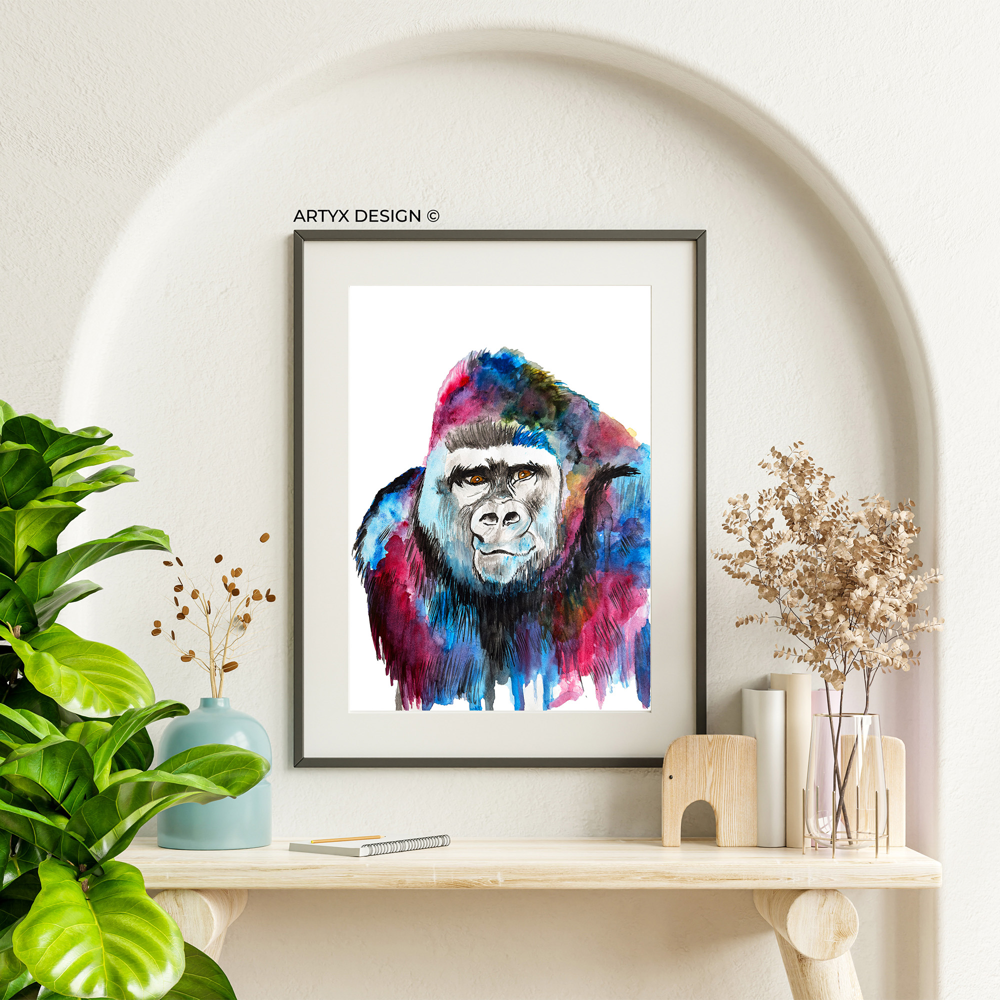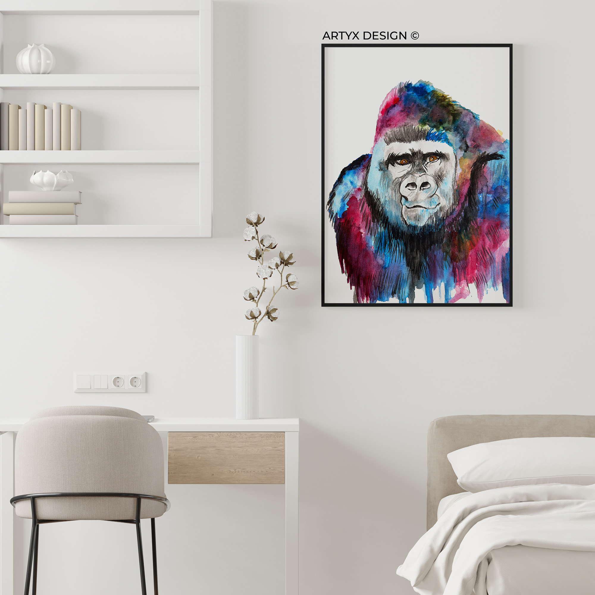 “Vibrant Gorilla” features a charming, colorful depiction of a cute gorilla. The painting’s vivid hues and playful expression bring a lively and endearing quality to this majestic creature. This artwork celebrates the gorilla’s gentle spirit and captivating presence through a burst of color and whimsy.